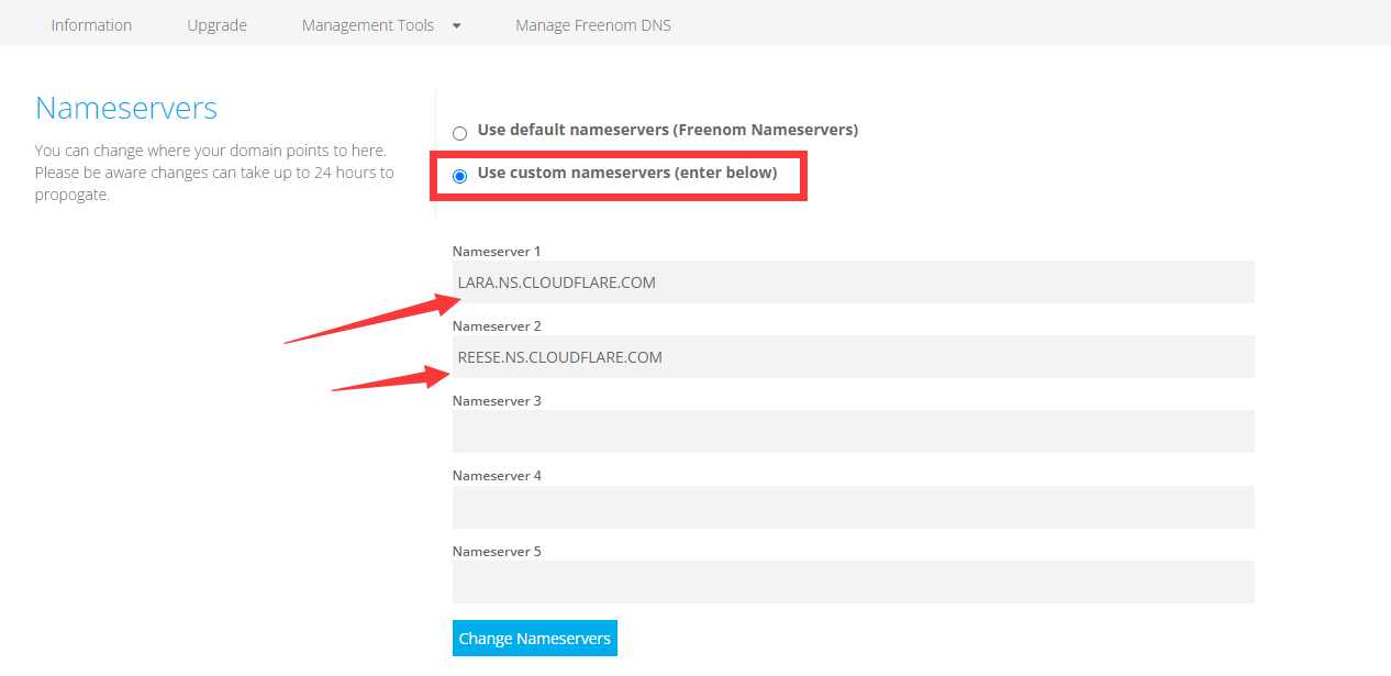freenom默认使用自己的NameServer,这样会很不方便,每次更改DNS都要登录Freenom官网。所以我把它改到Cloudflare托管。